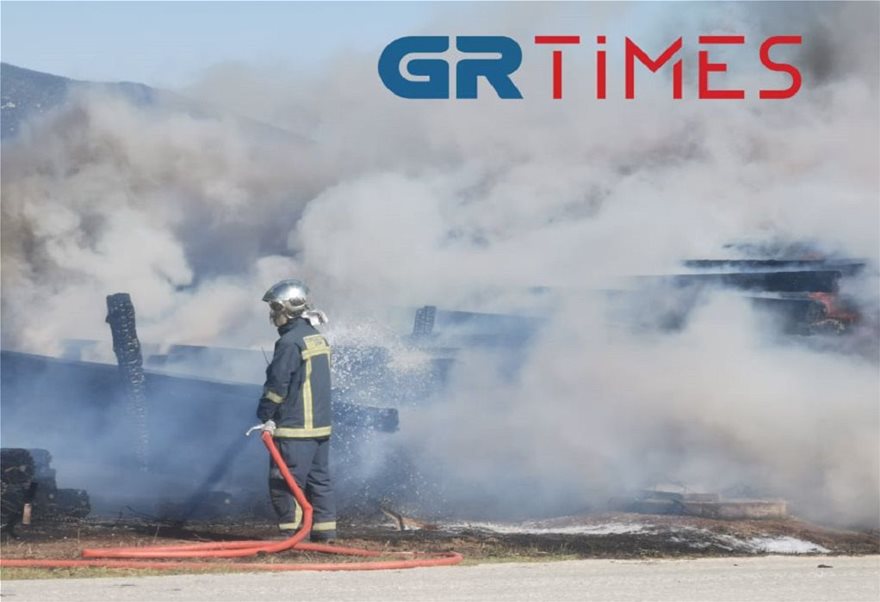 Μεγάλη φωτιά ξέσπασε το μεσημέρι της Τετάρτης σε αποθήκη με κολώνες της ΔΕΗ στην Θεσσαλονίκη.