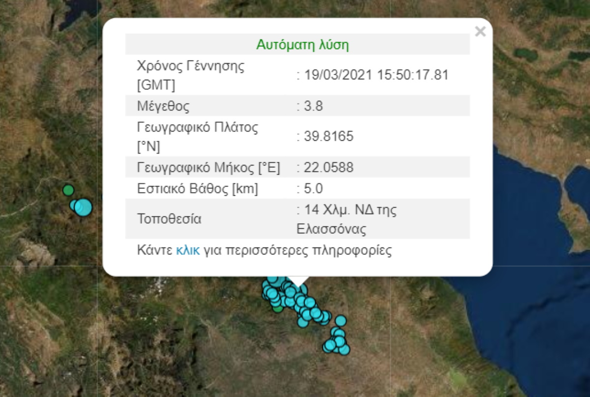 Νέος σεισμός έλαβε χώρα κοντά στην Ελασσόνα, στις 17.50, μεγέθους 3,8 Ρίχτερ, σύμφωνα με την αναθεωρημένη λύση του Γεωδυναμικού Ινστιτούτου.