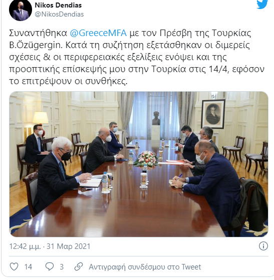 Σε σχετική ανάρτησή του ο κ. Δένδιας έγραψε: «Συναντήθηκα με τον Πρέσβη της Τουρκίας B.Özügergin. Κατά τη συζήτηση εξετάσθηκαν οι διμερείς σχέσεις & οι περιφερειακές εξελίξεις ενόψει και της προοπτικής επίσκεψής μου στην Τουρκία στις 14/4, εφόσον το επιτρέψουν οι συνθήκες».