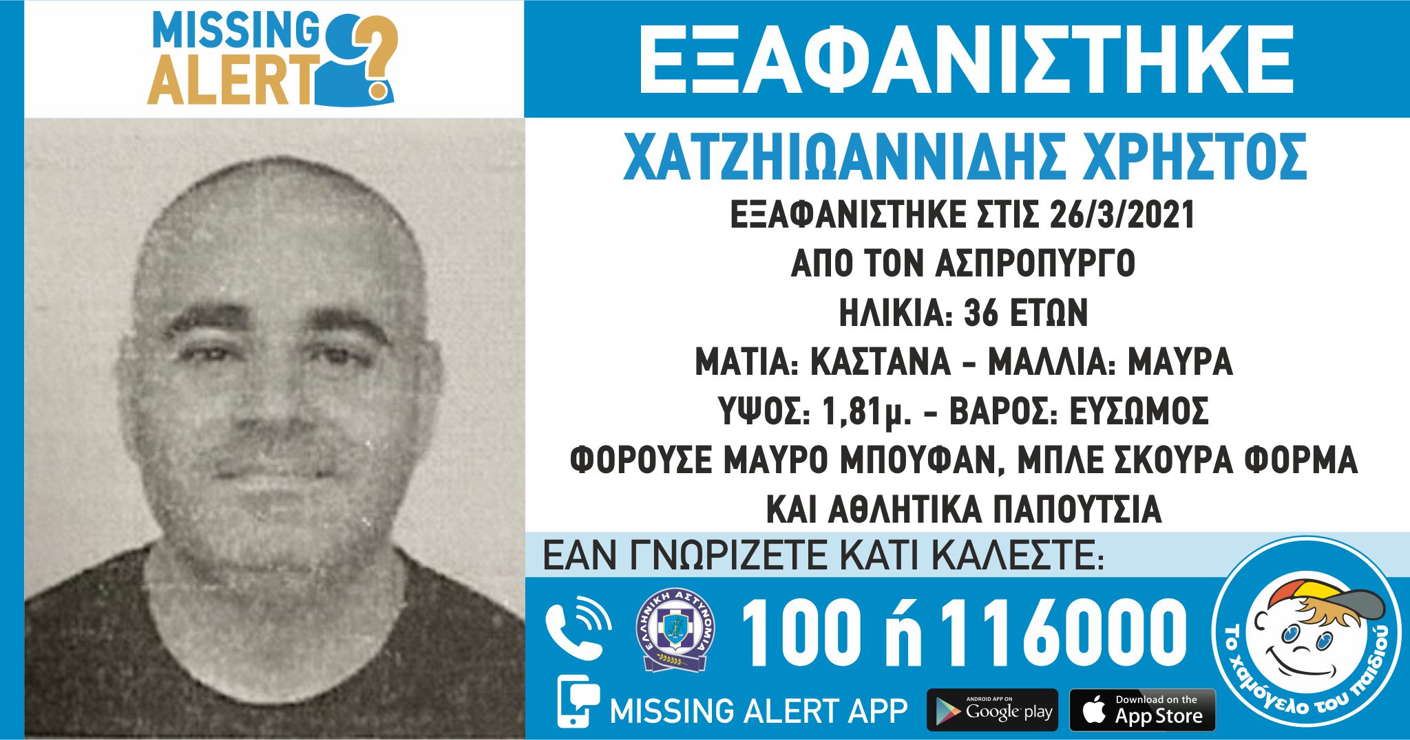 Πρόκειται για τον Χρήστο Χατζηιωαννίδη 36 ετών τα ίχνη του οποίου χάθηκαν στις 26/03/2021 ώρα 10:00 π.μ, από την περιοχή του Ασπροπύργου.