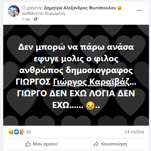 Το προφίλ του αστυνομικού ρεπόρτερ στο Facebook έχει ήδη γεμίσει από συλλυπητήρια μηνύματα φίλων, γνωστών και συνεργατών του.