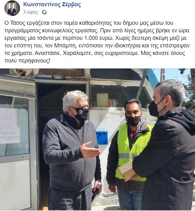 Ο κ. Ζέρβας ευχαρίστησε προσωπικά τον υπάλληλο και σε ανάρτησή του στο facebook έγραψε: «Ο Τάσος εργάζεται στον τομέα καθαριότητας του δήμου μας μέσω του προγράμματος κοινωφελούς εργασίας. Πριν από λίγες ημέρες βρήκε εν ώρα εργασίας μία τσάντα με περίπου 1000 ευρώ. Χωρίς δεύτερη σκέψη μαζί με τον επόπτη του, τον Μπάμπη, εντόπισαν την ιδιοκτήτρια και της επέστρεψαν τα χρήματα. Αναστάσιε, Χαράλαμπε, σας ευχαριστούμε. Μας κάνατε όλους πολύ περήφανους».