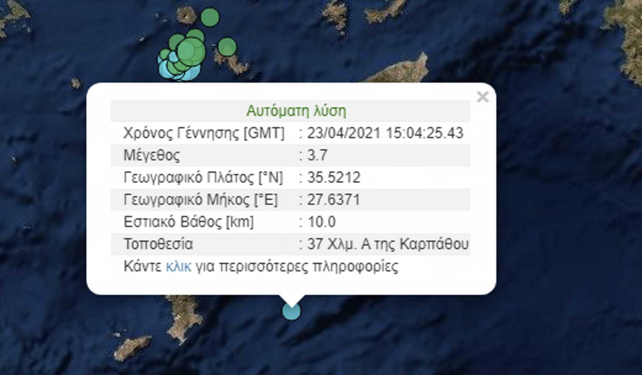 Το Γεωδυναμικό Ινστιτούτο του Εθνικού Αστεροσκοπείου Αθηνών γνωστοποίησε ότι λίγα λεπτά πριν τις 18:00 πραγματοποιήθηκε ισχυρός σεισμός μεγέθους 3,7 βαθμών της κλίμακας Ρίχτερ στην Κάρπαθο.