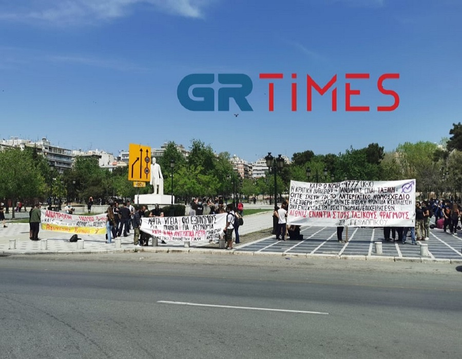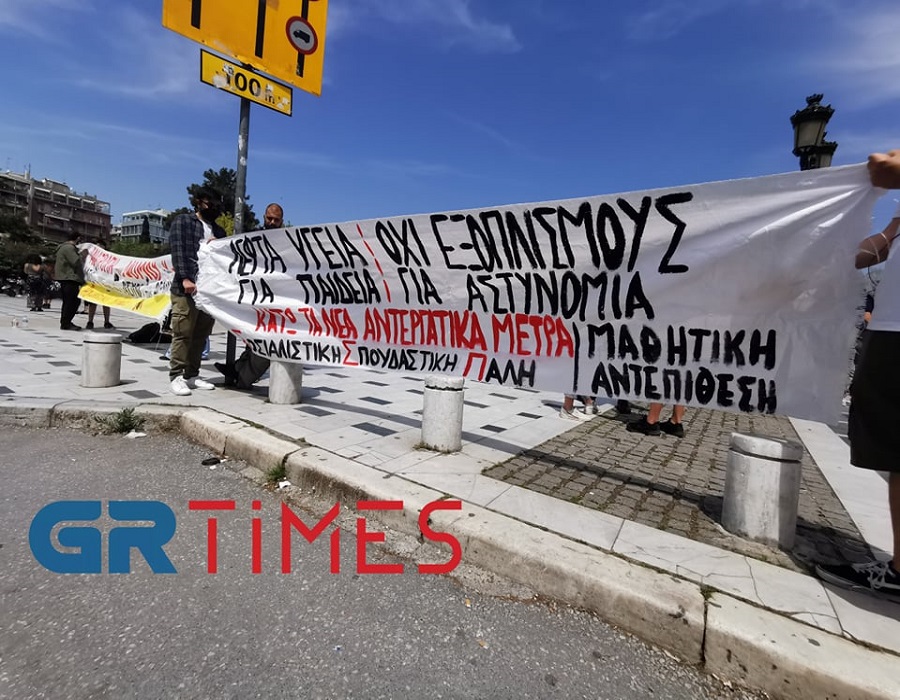 Φοιτητές πραγματοποίησαν συγκέντρωση στη μία το μεσημέρι στο άγαλμα του Ελευθερίου Βενιζέλου στη Θεσσαλονίκη και μετέπειτα πορεία με συνθήματα ενάντια στον νόμο για τις ανώτατες σχολές και στο νομοσχέδιο για τα εργασιακά.