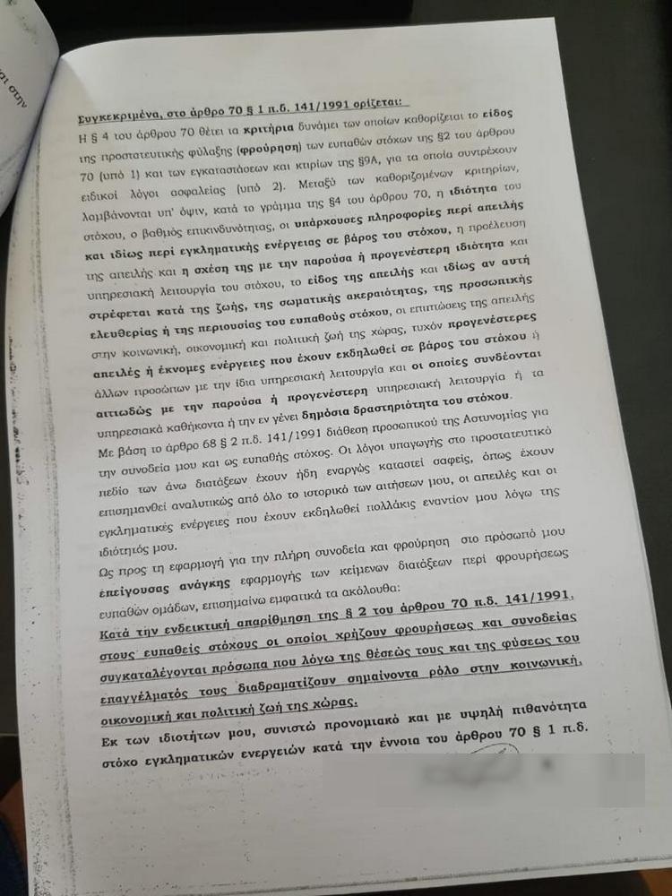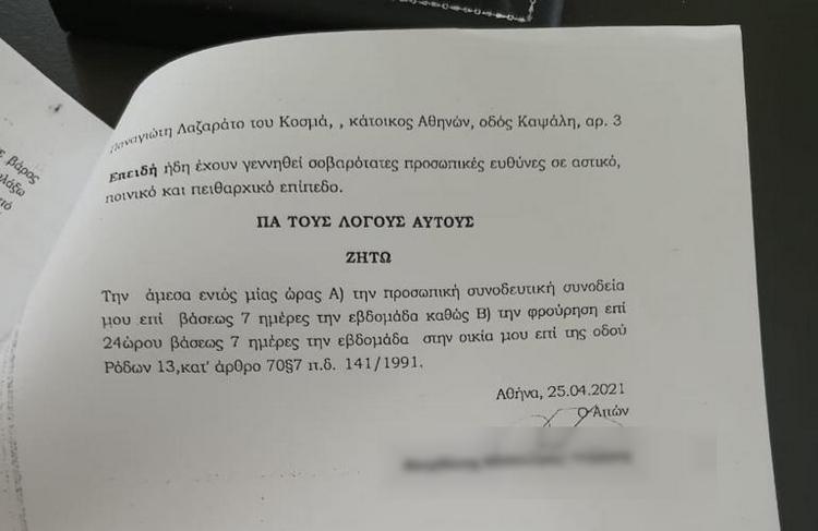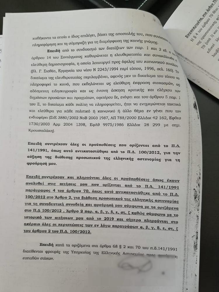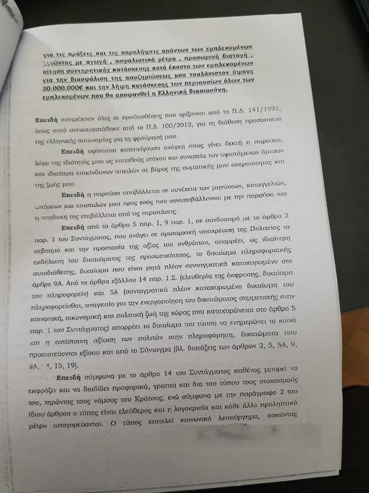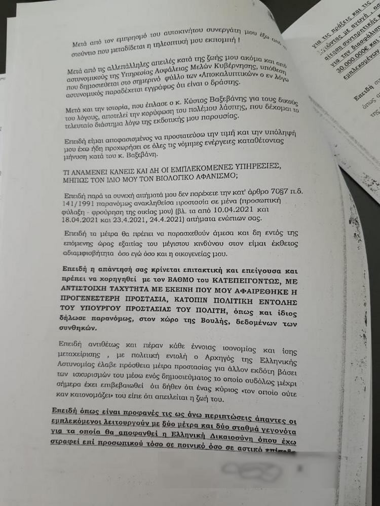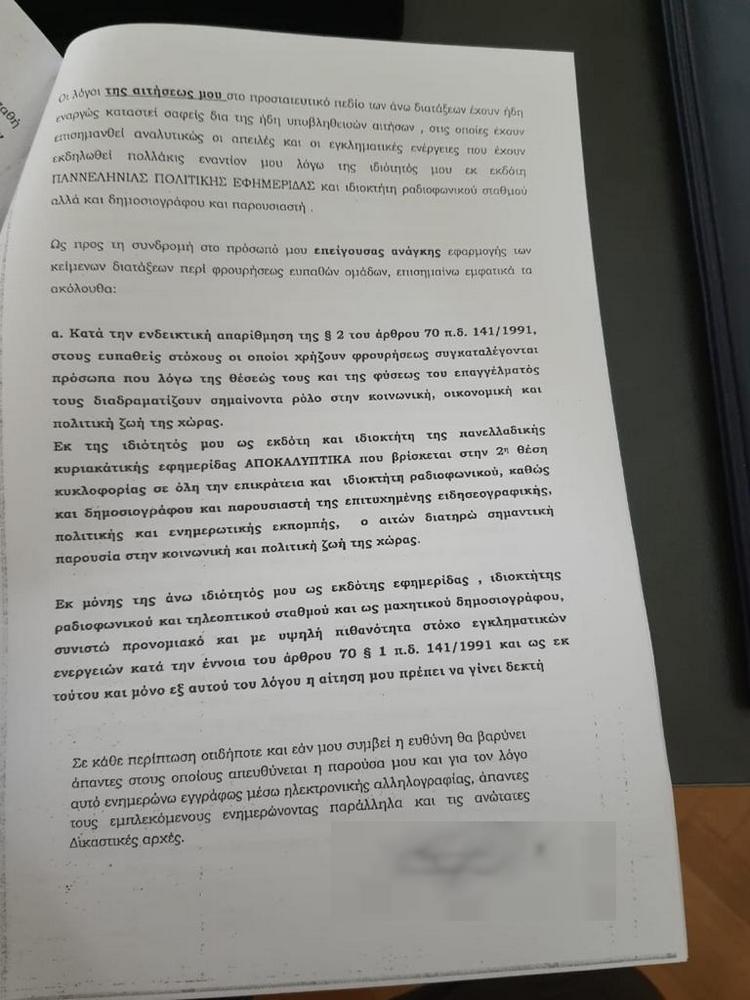 Παράλληλα και όπως αποκαλύπτει η Αυγή, νωρίτερα στις 24 Δεκεμβρίου ζητά να γίνει αορίστου διαρκείας η φρούρησή του και να του διατεθούν επιπλέον τρεις αστυνομικοί ανά βάρδια και μια υπηρεσιακή μοτοσικλέτα. Το κρίσιμο σε αυτή την επιστολή είναι ότι αναφέρεται σε στοχοποίησή του από την εφημερίδα Documento και την ιστοσελίδα Το Κουτί της Πανδώρας, δίχως άλλη αναφορά σε κάποιο μέσο ενημέρωσης.