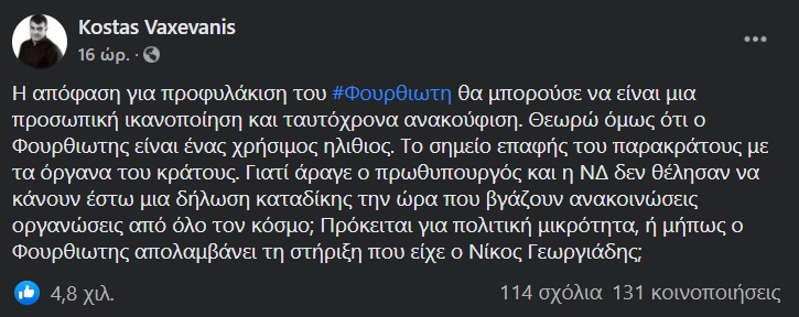 Με ανάρτηση του στο Facebook o εκδότης του Documento Κώστας Βαξεβάνης εκφράζει την ικανοποίηση και την ανακούφιση του για την προφυλάκιση Φουρθιώτη και των συνεργατών του, αλλά και την απορία που ο πρωθυπουργός και η ΝΔ δεν έκαναν την παραμικρή δήλωση καταδίκης.