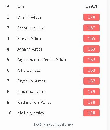 Με ανάρτησή της η ομάδα ΠΡΟΜΗΘΕΥΣ Εκτίμηση Κινδύνου Φυσικών & Τεχνολογικών Καταστροφών κρούει τον κώδωνα του κινδύνου για τις περιοχές που η ατμοσφαιρική ρύπανση είναι υψηλή. Η ομάδα παρουσιάζει την ποιότητα του αέρα που έχει επιδεινωθεί σε δέκα περιοχές και τονίζει ότι τα άτομα τα οποία πάσχουν από αναπνευστικά προβλήματα ή καρδιοαγγειακά προβλήματα δεν πρέπει να κυκλοφορούν ή να αθλούνται σε εξωτερικούς χώρους.