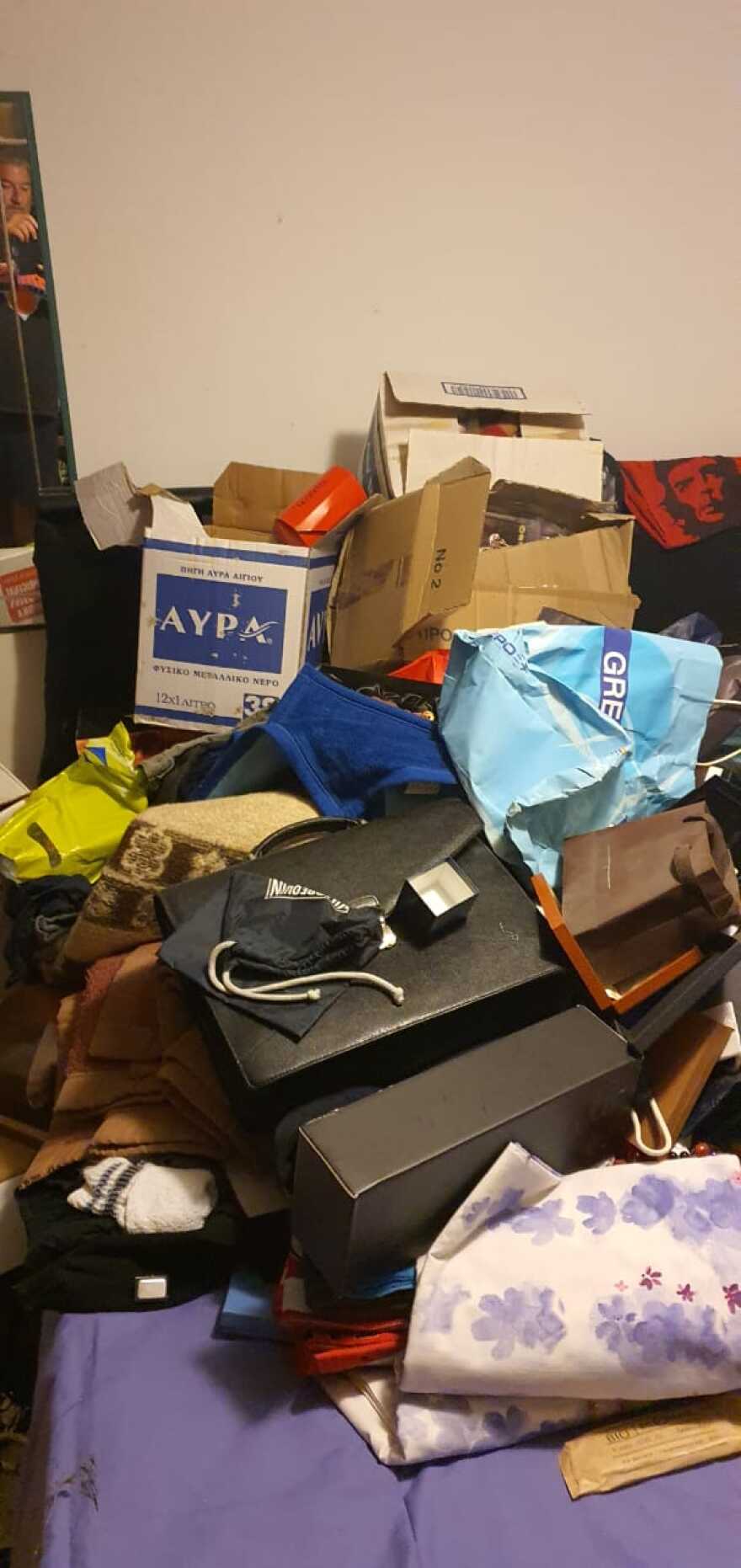 Και συνεχίζει: «Δεν παίρνουν όμως -ενώ τον βρίσκουν- ένα φάκελο με 1.000 ευρώ, που επίσης υπάρχει μέσα στο κομοδίνο για κάποια έκτακτη ανάγκη της κυρίας Καίτης. Τα ρούχα είναι πια όλα ένα λοφάκι επάνω στο κρεβάτι, αλλά όχι τα κουστούμια. Σαν να σεβάστηκαν τις επίσημες στολές του κυρίου Γραμματέα. Οι γραβάτες άθικτες! Όλοι οι μπλε φάκελοι της βιβλιοθήκης από τα glory days της εποχής του πρώην πρωθυπουργού Κώστα Καραμανλη ανοιγμένοι με τα χάρτινα ντοκουμενταριστά σωθικά τους ατάκτως ερριμμένα σαν αποκριάτικο κομφετί. Δεν ξέρω ακόμη τί λείπει και τί όχι. Τα «καλά» χαρτιά είναι σε θυρίδες. Στην κορυφή του υφασμάτινου λόφου φιγουράρει ένας πανάκριβος δερμάτινος χαρτοφύλακας Salvatore Ferragamo, δώρο της Βίβιαν από το 2004 όταν κερδίσαμε τις εκλογές. Δεν τον άνοιξαν καν. Τέλος, βγήκαν σαν κύριοι από την ήδη ανοιχτή μπαλκονόπορτα. Ούτε φυλαγόταν, ούτε θα φυλάσσεται…».