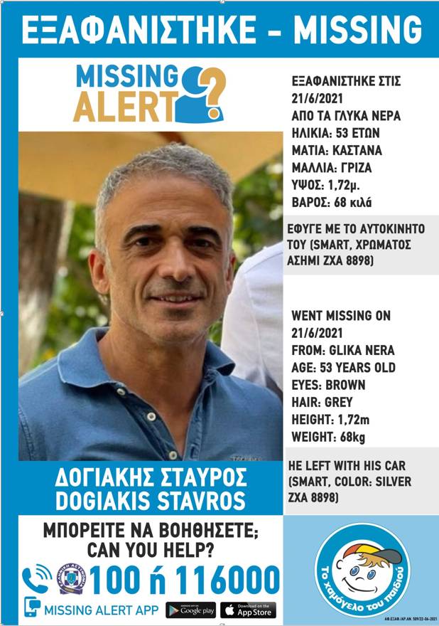 Χθες Δευτέρα, 21 Ιουνίου, εξαφανίστηκε από τα Γλυκά Νερά, ο Σταύρος Δογιάκης, 53 ετών.