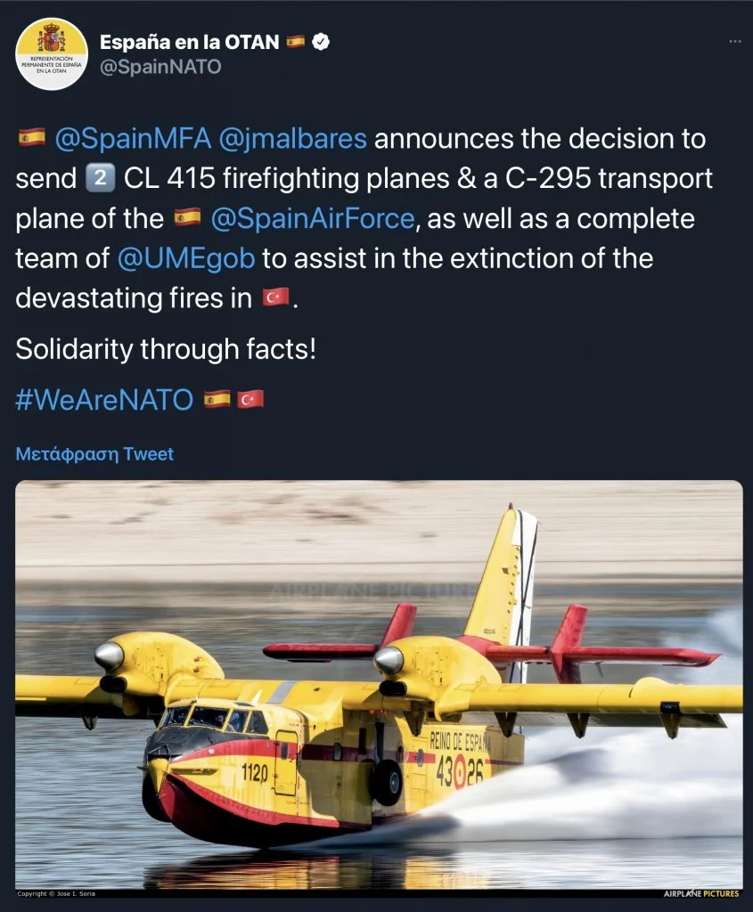Η «πανηγυρική» ανάρτηση της Ισπανίας για την αποστολής βοήθειας για τις φωτιές στην Τουρκία