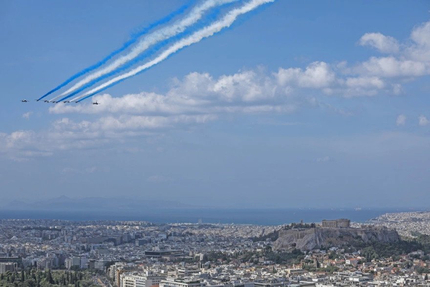 Μάλιστα, τα μαχητικά της Γαλλίας σχηματίζουν στον ουρανό τα χρώματα της Ελλάδας πάνω από την Ακρόπολη, όπως ανακοίνωσε το ΓΕΕΘΑ.
