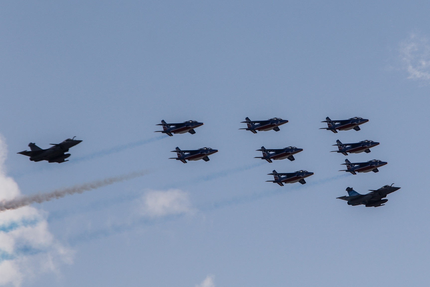 Ο εναέριος χώρος του λεκανοπεδίου Αττικής θα είναι «απασχολημένος» με την διέλευση μαχητικών αεροσκαφών από τις 10:45 έως και τις 11:00 την Δευτέρα. Ειδικότερα, δύο γαλλικά μαχητικά Rafale και το ακροβατικό σμήνος της γαλλικής Αεροπορίας «Patrouille de France» πέταξαν στον ουρανό Αθήνας.