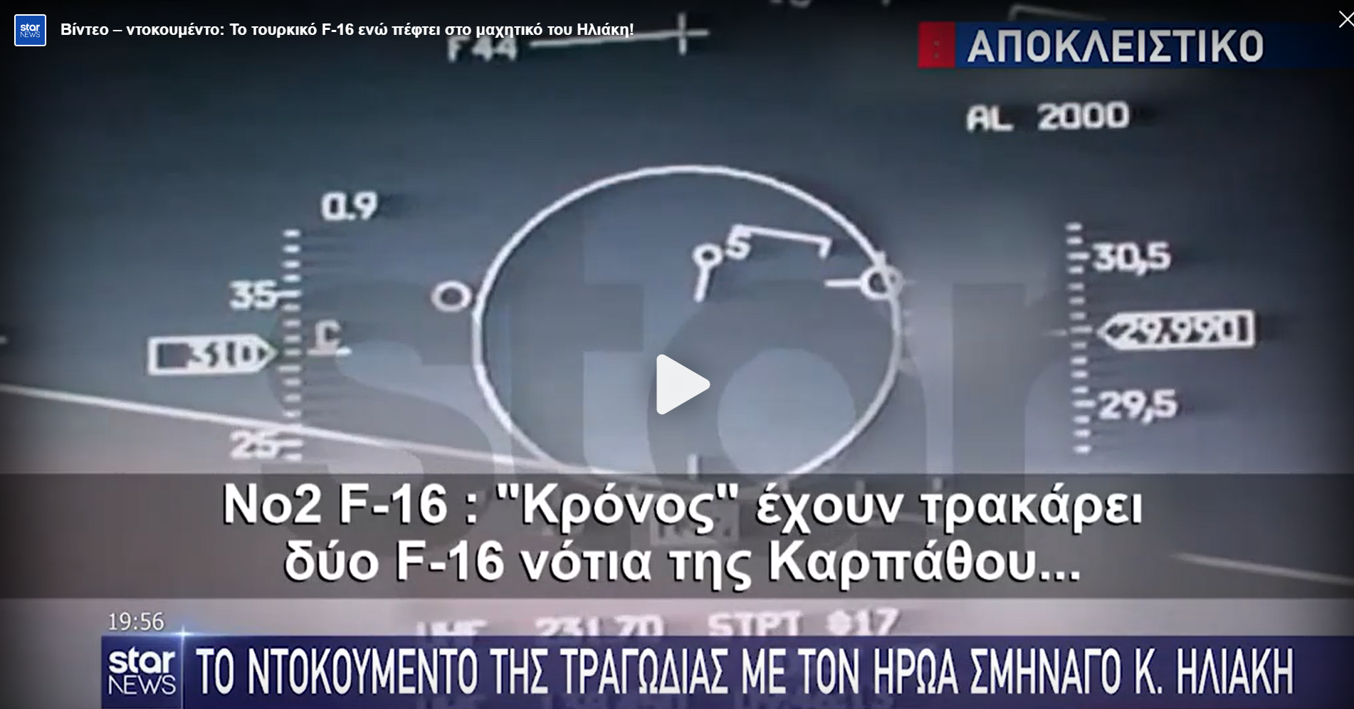 Ένα βίντεο που δείχνει τη στιγμή που το τουρκικό F-16 πέφτει πάνω στο μαχητικό του ήρωα σμηναγού Κωνσταντίνου Ηλιάκη, πάνω από το Αιγαίο Πέλαγος, στις 23 Μαΐου 2006, παρουσίασε σήμερα ο τηλεοπτικός σταθμός Star.