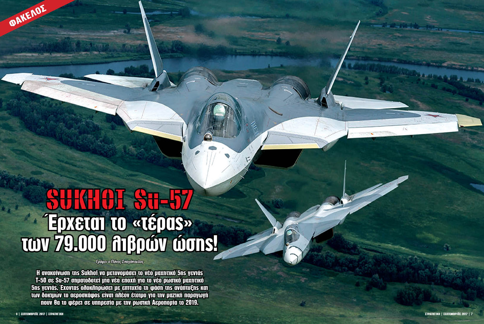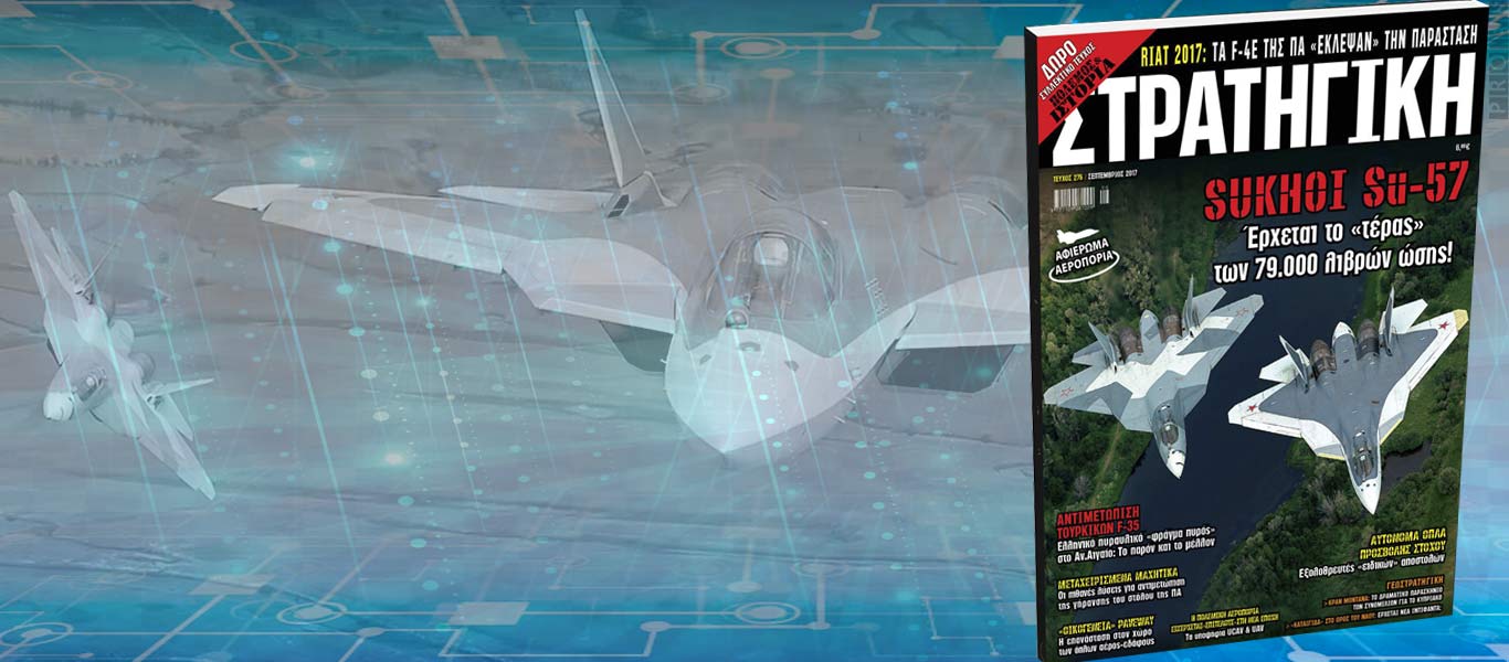 Σε ένα τεύχος-αφιέρωμα στην Αεροπορία, η νέα ΣΤΡΑΤΗΓΙΚΗ κυκλοφορεί με μια μεγάλη αποκλειστικότητα: Εναν πλήρη φάκελο για το Su-57, το “τέρας” των 79.000 λιβρών ώσης, το υπερμαχητικό 5ης γενιάς της ρωσικής Αεροπορίας, το οποίο θα αρχίσει να εντάσσεται στο οπλοστάσιο της από το 2020.