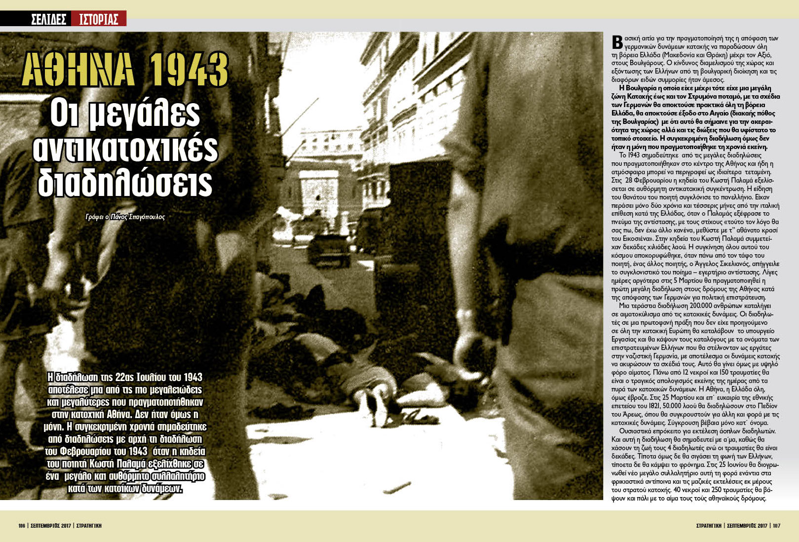 Η συγκεκριμένη χρονιά σημαδεύτηκε από διαδηλώσεις με αρχή τη διαδήλωση του Φεβρουαρίου του 1943 όταν η κηδεία του ποιητή Κωστή Παλαμά εξελίχθηκε σε ένα μεγάλο και αυθόρμητο συλλαλητήριο κατά των κατοχικών δυνάμεων.