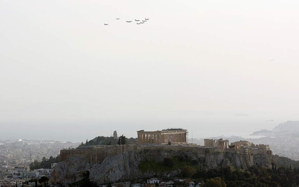 Εντυπωσιακή διέλευση πάνω από την Ακρόπολη σχηματισμού οχτώ μαχητικών της ελληνικής Πολεμικής Αεροπορίας και των φίλων χωρών που τιμούν με τη συμμετοχή τους στην πολυεθνική άσκηση ΗΝΙΟΧΟΣ 2019 που βρίσκεται σε εξέλιξη στην Ανδραβίδα.