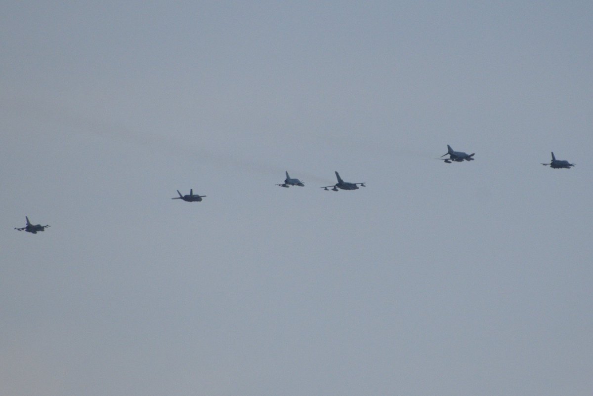 Στον σχηματισμό του οποίου ηγούνταν ένα ελληνικό Mirage 2000-5, ακολουθούμενο από ένα Phantom F-4, επίσης της Πολεμικής Αεροπορίας, συμμετείχαν επίσης δύο ελληνικά F-16, ένα αμερικανικό και ένα ισραηλινό του ιδίου τύπου, ένα Tornado της ιταλικής Αεροπορίας και φυσικά η μεγάλη ατραξιόν: