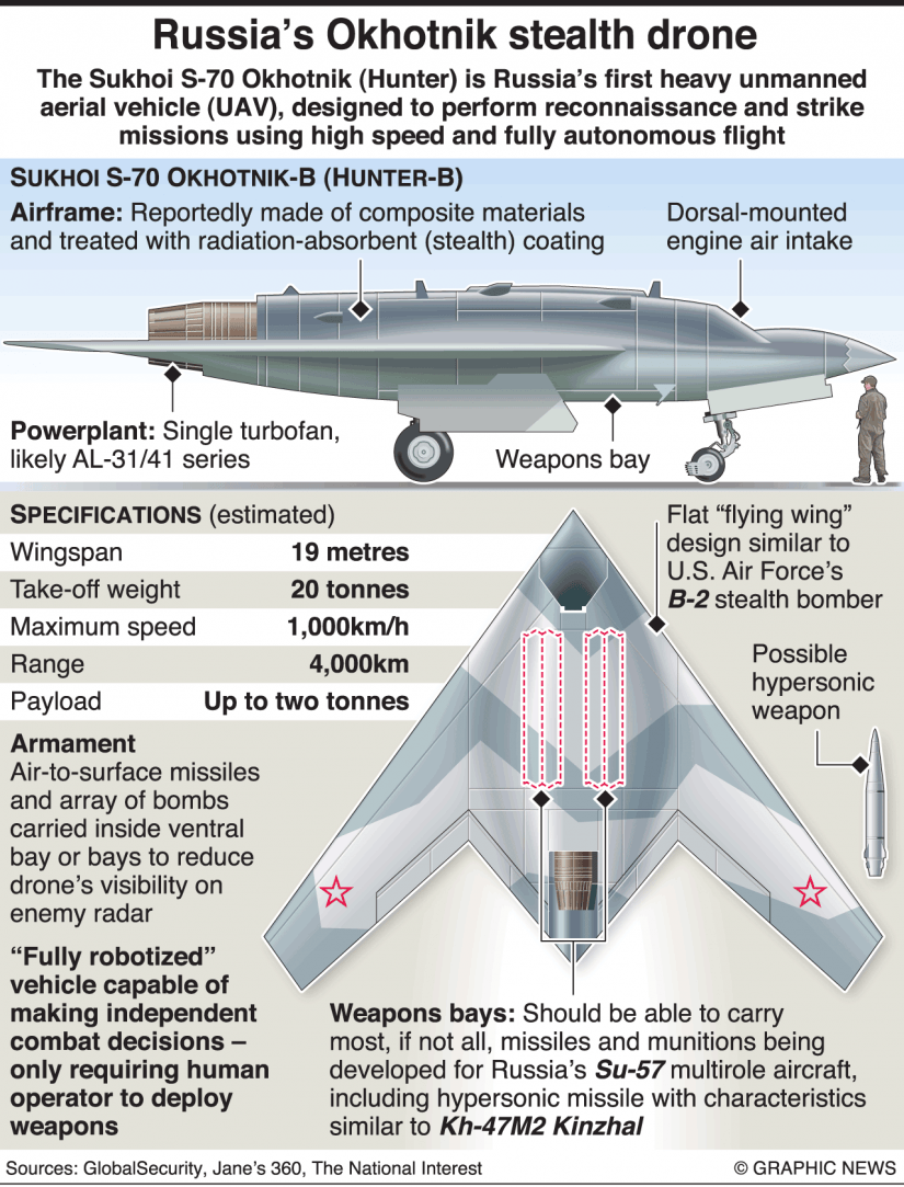 Το μη επανδρωμένο, stealth μαχητικό στρατηγικής κρούσης Sukhoi S-70 Okhotnik-B, έχει απίστευτες επιδόσεις στο εναέριο πεδίο μάχης, ενώ εντυπωσιάζει με τον όγκο του, αφού είναι μακράν το μεγαλύτερο μη επανδρωμένο αερόχημα παγκοσμίως.
