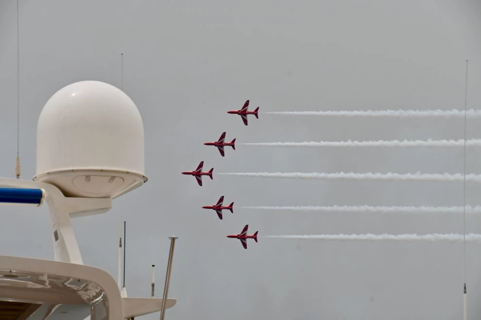 Αυτή δεν είναι η πρώτη φορά που τα βρετανικά «Κόκκινα Βέλη» (Red Arrows) πετούν στους ελληνικούς αιθέρες, αφού στο παρελθόν έχουν συμμετάσχει τόσο στην Athens Flying Week στην Τανάγρα, ενώ τα «Red Arrows» ακόμα έχουν τιμήσει επετείους μαχών όπου τα βρετανικά και τα ελληνικά στρατεύατα πολέμησαν μαζί κατά την διάρκεια του Β’ Παγκοσμίου Πολέμου.