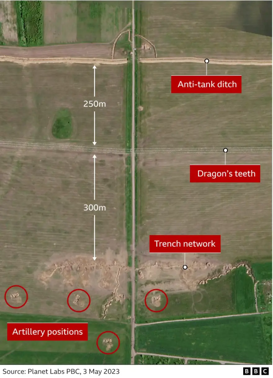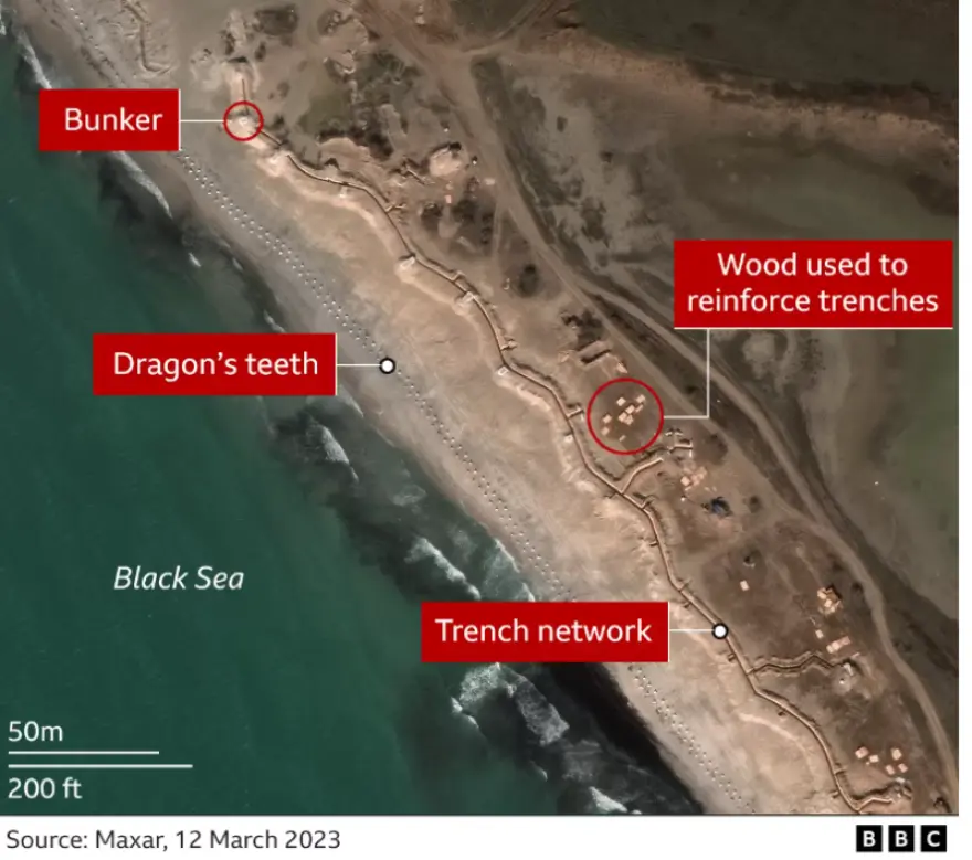 Συγκεκριμένα, εξετάζοντας εκατοντάδες δορυφορικές εικόνες, το BBC εντόπισε ορισμένα βασικά σημεία από τη σημαντική συσσώρευση τάφρων και άλλων οχυρών στη νότια Ουκρανία από τον περασμένο Οκτώβριο τα οποία αποτελούν οχυρά των Ρώσων.