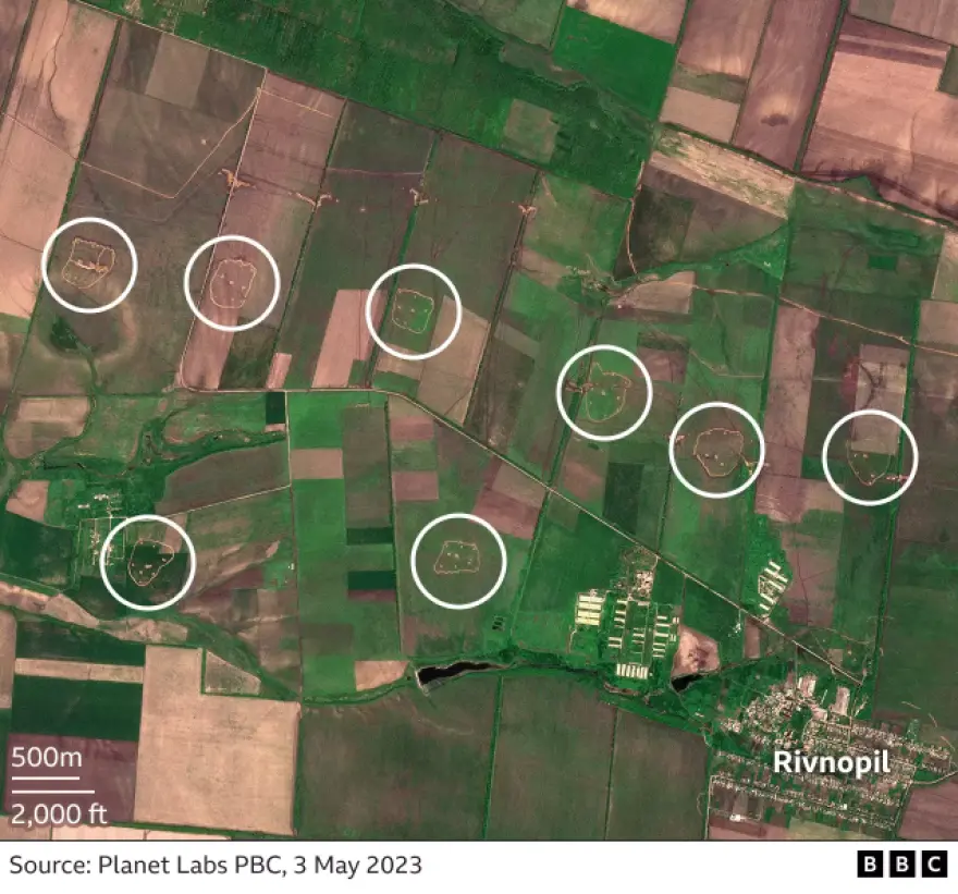 Δεδομένου ότι η Ρωσία αναμένει από την Ουκρανία να προσπαθήσει να την ανακαταλάβει, το BBC Verify αποφάσισε να εξετάσει την περιοχή γύρω από την πόλη – οδηγώντας στην ανακάλυψη μιας συλλογής κυκλικών χαρακωμάτων. Αυτή βρίσκεται κοντά στο μικρό χωριό Rivnopil, περίπου 34 μίλια (55 χιλιόμετρα) βόρεια της Μαριούπολης, όπου κάθε κυκλική τάφρο έχει ένα ανάχωμα χώματος στη μέση, πιθανώς είτε για να προστατεύσει το πυροβολικό είτε για να διατηρήσει τα όπλα σταθερά.