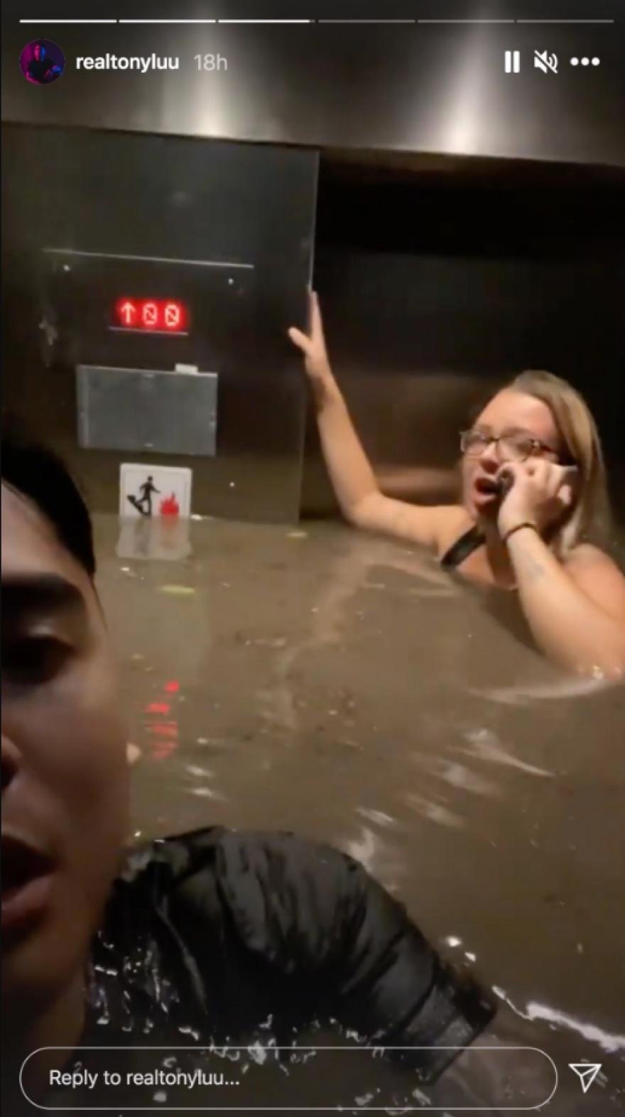 Ο Τόνι Λου, ανέβασε ένα βίντεο στο Instagram, στο οποίο φαίνεται αυτός και ακόμα μία γυναίκα να έχουν εγκλωβιστεί στο ασανσέρ και το νερό να έχει φτάσει μέχρι τον λαιμό τους.