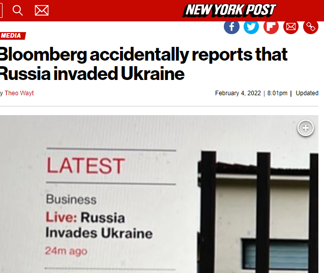 Το Bloomberg δημοσίευσε, χθες Παρασκευή, έναν τίτλο σχετικά με ρωσική «εισβολή» στην Ουκρανία αλλά, στη συνέχεια, παραδέχτηκε το λάθος του και τον αφαίρεσε.