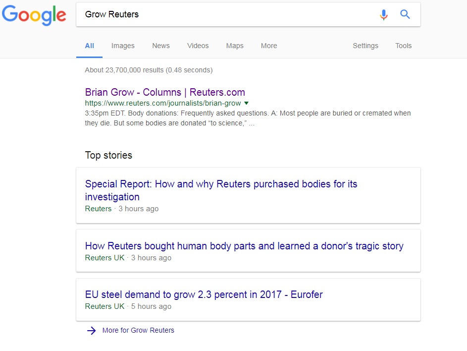 Για να αγοράσει ανθρώπινα όργανα, ο δημοσιογράφος του Reuters, Brian Grow, έστειλε τις ερωτήσεις του σε διάφορους «μεσίτες σωμάτων» χρησιμοποιώντας το εταιρικό του e-mail! Χρησιμοποίησε το πραγματικό του όνομα και το όνομα του εργοδότη του… Δηλαδή «Thomson Reuters»! Δεν αποκάλυψε πως ήταν δημοσιογράφος. Παρόλο που θα το έλεγε αν ερωτούνταν. Μια απλή αναζήτηση στο Google χρησιμοποιώντας τις λέξεις «Grow» και «Reuters» θα ήταν αρκετή για να αποκαλυφθεί πως εργάζεται ως δημοσιογράφος.