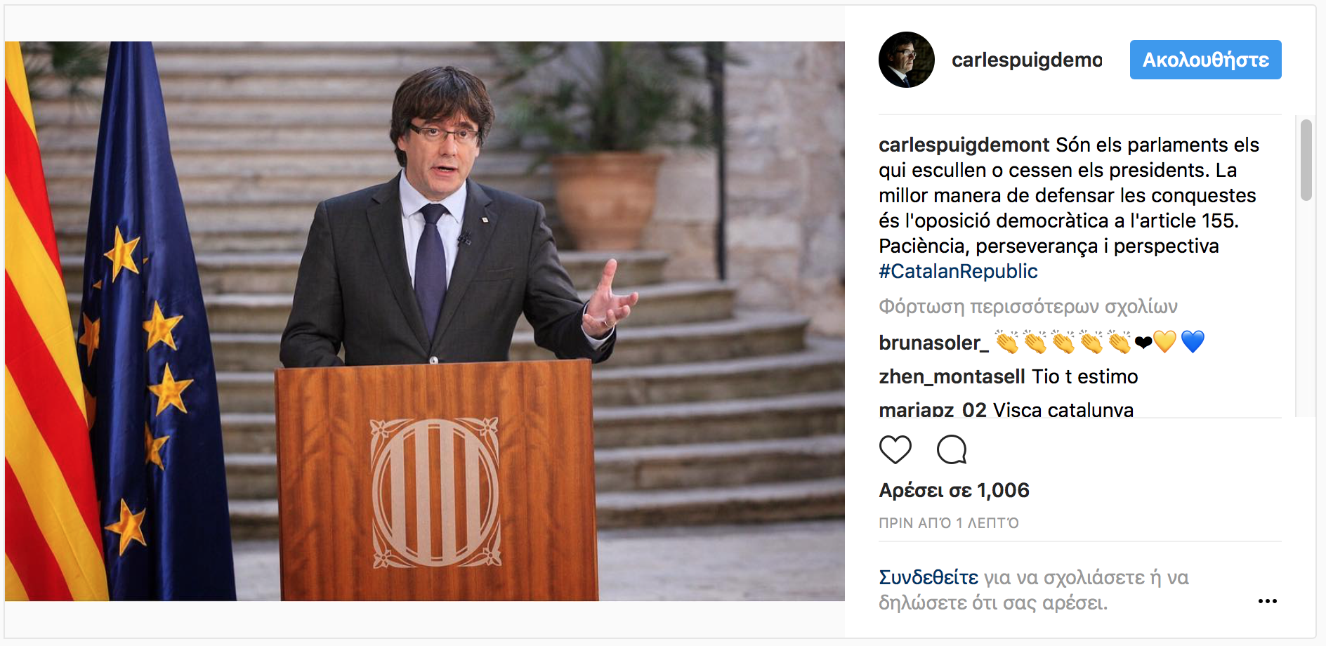 Σε τηλεοπτικό διάγγελμά του ο αυτονομιστής πρόεδρος της Καταλονίας Κάρλες Πουτζδεμόν, τον οποίο απέπεμψε χθες βράδυ η ισπανική κυβέρνηση, κάλεσε τους πολίτες της Καταλονίας να αντισταθούν στις ισπανικές δυνάμεις ασφαλείας και να αποτρέψουν καταστολή του κινήματος ανεξαρτησίας!