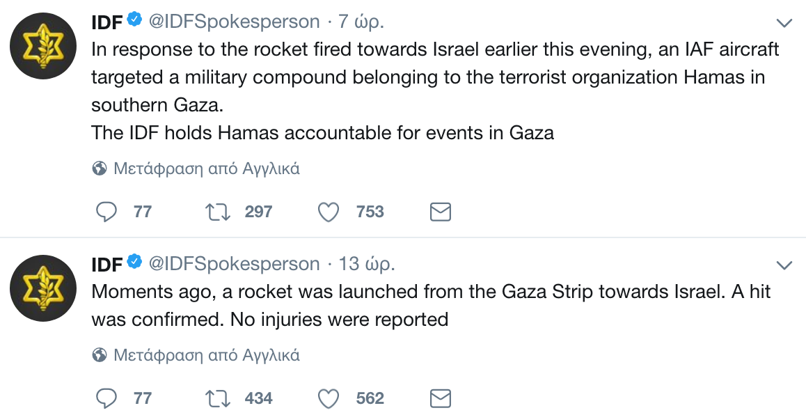 Το βράδυ της Δευτέρας εκτοξεύθηκε ρουκέτα από τη Λωρίδα της Γάζας, πλήττοντας το νότιο Ισραήλ, χωρίς να προκαλέσει θύματα ή ζημιές.