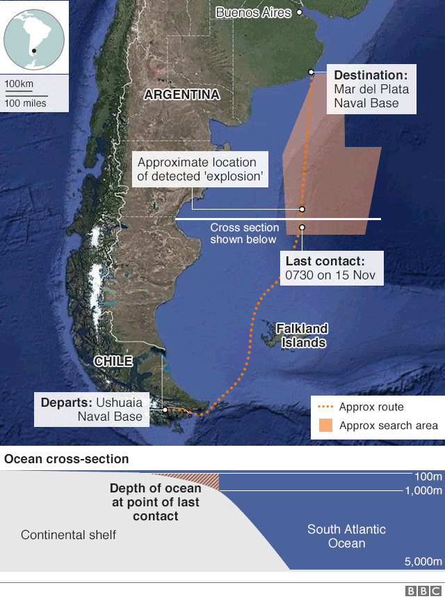 Το σκάφος του ρωσικού Ναυτικού το πλοίο Yantar ερευνά στον νότιο Ατλαντικό για την ανεύρεση του υποβρυχίου του Ναυτικού της Αργεντινής το οποίο καταστράφηκε ύστερα από έκρηξη και βυθίστηκε αύτανδρο σύμφωνα με τις μέχρι τώρα πληροφορίες.