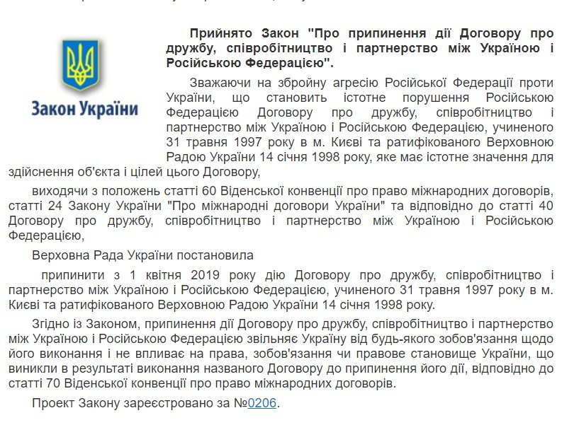 Παράλληλα σήμερα το Κοινοβούλιο της Ουκρανίας ψήφισε υπέρ της ακύρωσης της “Συνθήκης Φιλίας και Συνεργασίας με την Ρωσία”. Αυτό θα ισχύσει από 1η Απριλίου 2019.
