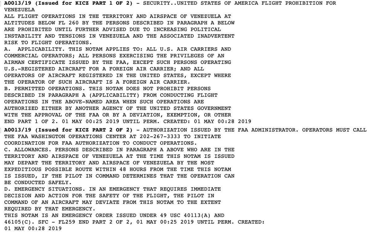 Προ των πυλών φαίνεται πως βρίσκεται κάποιου είδους αμερικανική στρατιωτική παρέμβαση στο Καράκας καθώς πριν λίγο με NOTAM οι ΗΠΑ απαγόρευσαν σε όλα τα αεροσκάφη πολιτικής αεροπορίας να πετούν κάτω από τα 26000 πόδια στον εναέριο χώρο της Βενεζουέλας.