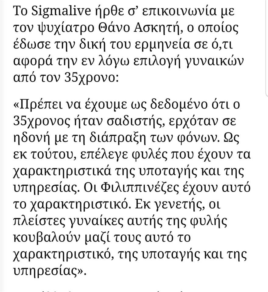 Σάλος έχει προκληθεί στη Κύπρο με την τοποθέτηση του γνωστού ψυχίατρου Θάνου Ασκητή ο οποίος κλήθηκε να εξηγήσει γιατί ο serial killer της Κύπρου επέλεγε γυναίκες από τις Φιλιππίνες ως θύματα του.