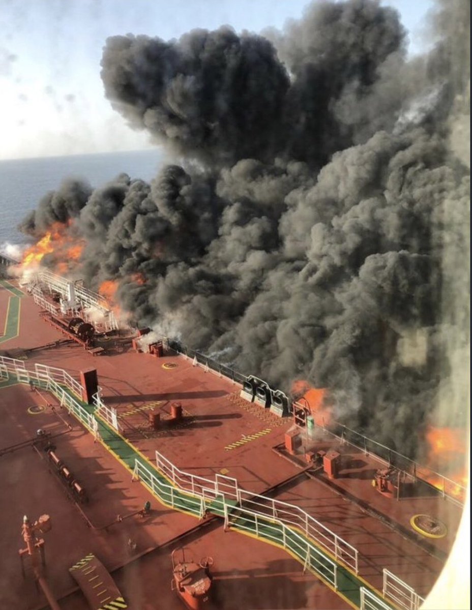 Aerial footage shows one of the oil tankers targeted in the Sea of Oman#SeaofOman pic.twitter.com/mdvEPPT3J4