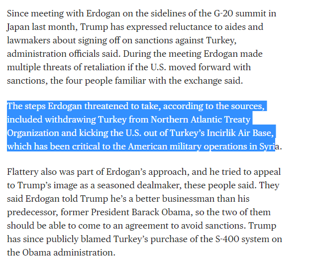 Ο πρόεδρος των ΗΠΑ, Ν.Τραμπ, μιλώντας σε 42 γερουσιαστές για την αιτία που πρόβαλε βέτο στις κυρώσεις σε βάρος της Τουρκίας για την απόκτηση του ρωσικού πυραυλικού συστήματος S-400 αποκάλυψε ότι σύμφωνα με πληροφορίες «Η Αγκυρα είναι αποφασισμένη να κλείσει τις ΝΑΤΟϊκές βάσεις του Ιντσιρλίκ και Κιουρετσίκ και στην συνέχεια θα αποχωρήσει από το ΝΑΤΟ αν υπάρξουν κυρώσεις»!