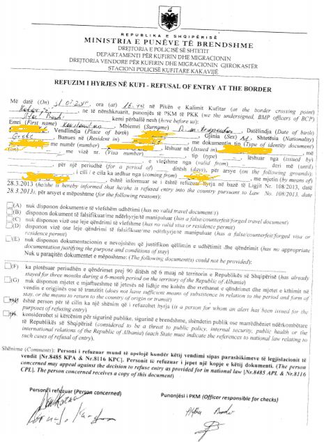 Από τις αλβανικές αστυνομικές αρχές δεν του «αποκαλύφθηκε» ο λόγος για τον οποίο του απαγορεύεται η είσοδος στη χώρα, παρά το ότι ο ίδιος ζήτησε την αιτιολόγηση αυτής της επίσημης άρνησης εισόδου. Στο σχετικό έγγραφο του «Υπουργείου Εσωτερικών Υποθέσεων» που του επιδόθηκε, αναφέρεται πως «θεωρείται απειλή για την δημόσια τάξη, εσωτερική ασφάλεια, δημόσια υγεία ή τις διεθνείς σχέσεις της Δημοκρατίας της Αλβανίας».