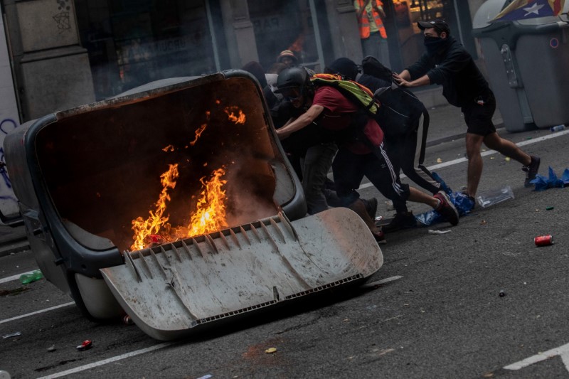 Διαδηλωτές, με καλυμμένα τα πρόσωπά τους, συγκρούστηκαν με την αστυνομία στο κέντρο της Βαρκελώνης, την πέμπτη ημέρα των κινητοποιήσεων κατά της φυλάκισης των αυτονομιστών ηγετών.