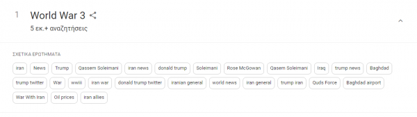 Αυξάνονται συνεχώς οι χρήστες του διαδικτύου, που αναζητούν την φράση «Τρίτος Παγκόσμιος Πόλεμος», καθώς ο φόβος για κλιμάκωση των συγκρούσεων αλλά και ενός παγκοσμίου πολέμου είναι μεγάλος. Πλήθος ανθρώπων ανά τον κόσμο –αλλά ιδιαίτερα πολίτες των ΗΠΑ- αναζητούν τον όρο «WWIII» ή «World War 3» τόσο στην Google όσο και στο Twitter, όπου έχει γίνει το πιο δημοφιλές τρεντ, όπως γράφει ο βρετανικός Independent.