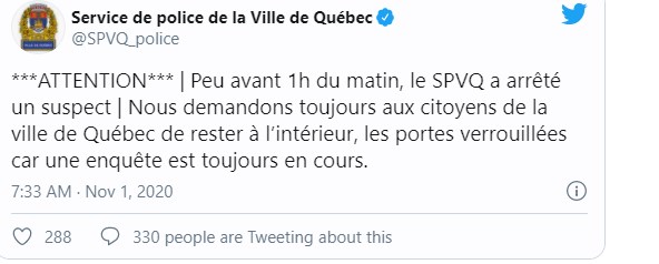 Σύμφωνα με το Radio Canada υπάρχουν δύο νεκροί και πέντε τραυματίες. Η Αστυνομία, σύμφωνα με τον ραδιοφωνικό σταθμό, καταδίωξε έναν άνδρα «ντυμένο με μεσαιωνικά ρούχα» κι οπλισμένο με ένα αιχμηρό αντικείμενο, πιθανότατα μαχαίρι, ο οποίος είχε αφήσει «πολλά θύματα». Η Αστυνομία είπε το συμβάν έλαβε χώρα κοντά στο κτίριο της Εθνοσυνέλευσης και ζήτησε από τους πολίτες να παραμείνουν στα σπίτια τους.