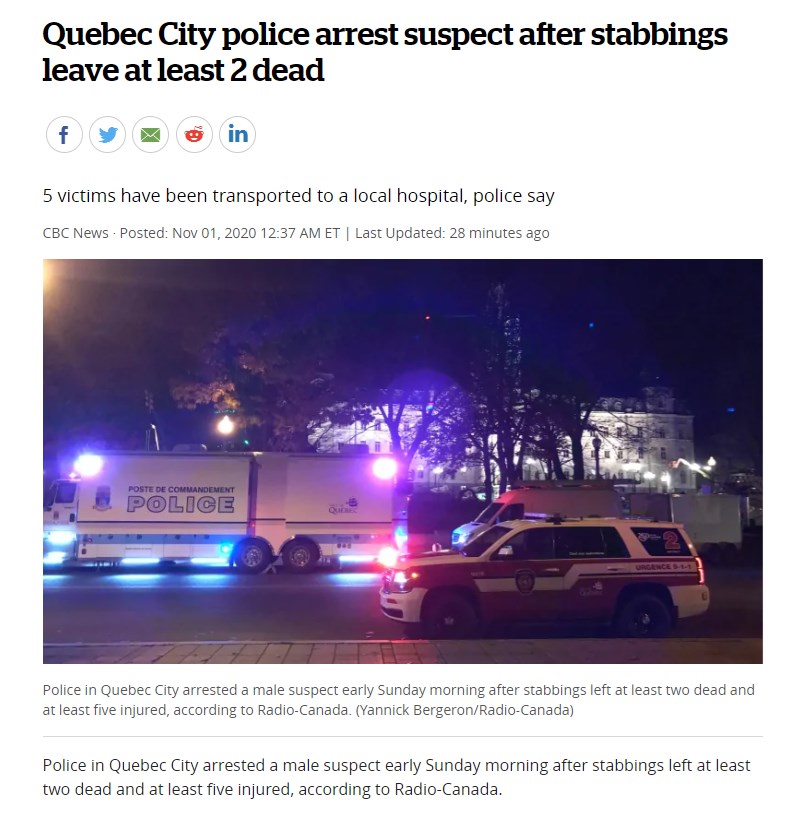 Σύμφωνα με το Radio Canada υπάρχουν δύο νεκροί και πέντε τραυματίες. Η Αστυνομία, σύμφωνα με τον ραδιοφωνικό σταθμό, καταδίωξε έναν άνδρα «ντυμένο με μεσαιωνικά ρούχα» κι οπλισμένο με ένα αιχμηρό αντικείμενο, πιθανότατα μαχαίρι, ο οποίος είχε αφήσει «πολλά θύματα». Η Αστυνομία είπε το συμβάν έλαβε χώρα κοντά στο κτίριο της Εθνοσυνέλευσης και ζήτησε από τους πολίτες να παραμείνουν στα σπίτια τους.