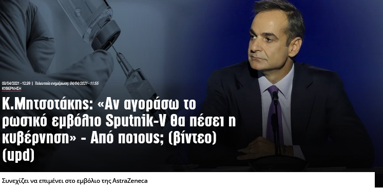 «Εκτός αν στο βάθος του μυαλού σας υπάρχει μια σατανική σκέψη ότι θα μπορούσε να συμβεί στην Ελλάδα, αυτό που έγινε στη Σλοβακία, όπου ο τέως συνάδελφός μου, επιχείρησε να αγοράσει το εμβόλιο Sputnik, έγινε φοβερή πολιτική κρίση και αναγκάστηκε να παραιτηθεί από τη θέση του. Αν αυτό έχετε στο μυαλό σας, φοβάμαι δεν θα σας κάνω το χατίρι», είχε πει ο Κυριάκος Μητσοτάκης.