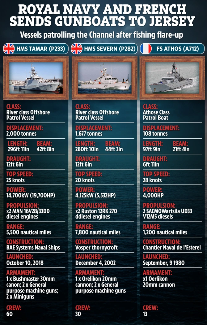 Λίγα μίλια από εκεί, δύο πολεμικά πλοία του Βασιλικού Πολεμικού Ναυτικού, τα HMS Severn και HMS Tamar, αναπτύχθηκαν για να «επιτηρούν την κατάσταση», σύμφωνα με εκπρόσωπο του βρετανικού υπουργείου Άμυνας, ο οποίος έκανε λόγο για «ένα αυστηρά προληπτικό μέτρο που ελήφθη σε συμφωνία με την κυβέρνηση του Τζέρσεϊ».