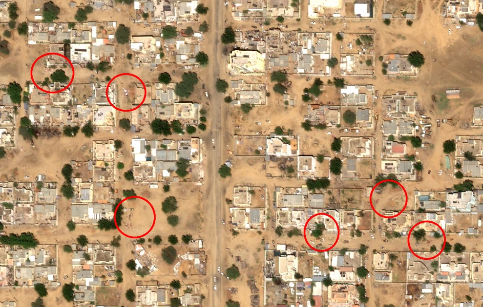 Ανάλυση από το Εργαστήριο Ανθρωπιστικής Έρευνας (HRL) της Σχολής Δημόσιας Υγείας του Yale, το οποίο παρακολουθεί την πολιορκία χρησιμοποιώντας δορυφορικές εικόνες και ανοιχτές πηγές, εντόπισε συστάδες αντικειμένων «συμβατές με το μέγεθος ανθρώπινων σωμάτων και ερυθρό έδαφος», που θεωρείται ότι προκλήθηκε από αίμα.