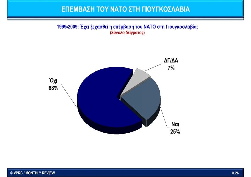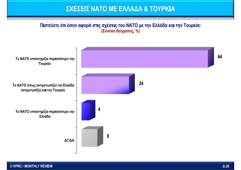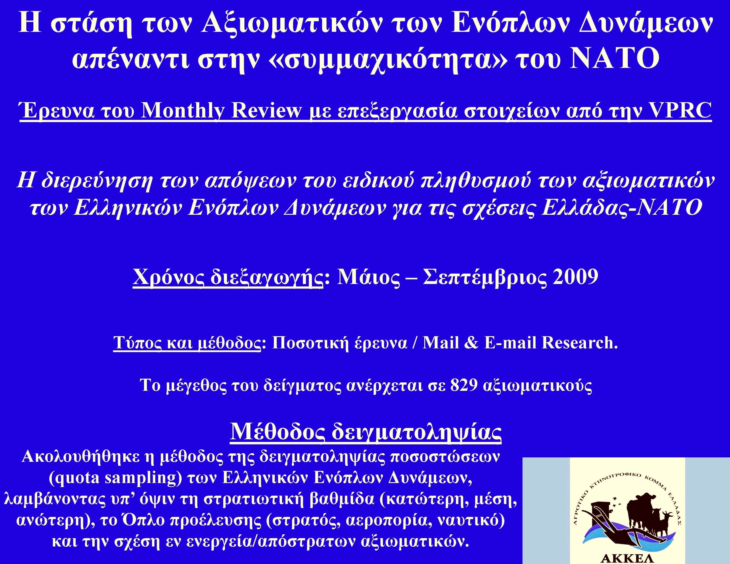 Πριν από 13 χρόνια ακόμη, τέτοια εποχή, μεταξύ Μαΐου-Σεπτεμβρίου 2009, 45σέλιδη εσωτερική δημοσκόπηση του Monthly Review στο προσωπικό των ελληνικών Ενόπλων Δυνάμεων, με επεξεργασία στοιχείων από την VPRC που υπάρχει ολόκληρη στην https://t.me/AKKELparty/200, αποκάλυψε ότι ειδικά για το ΝΑΤΟ και τον ρόλο των Αμερικανών ως συμμάχων, οι στρατιωτικοί απάντησαν ότι ο βασικός λόγος της συμμετοχής μας στο ΝΑΤΟ είναι να εξισορροπούμε την επιρροή της Τουρκίας εναντίον της Ελλάδας και το 64% απάντησε ότι το ΝΑΤΟ υποστηρίζει περισσότερο την Τουρκία.