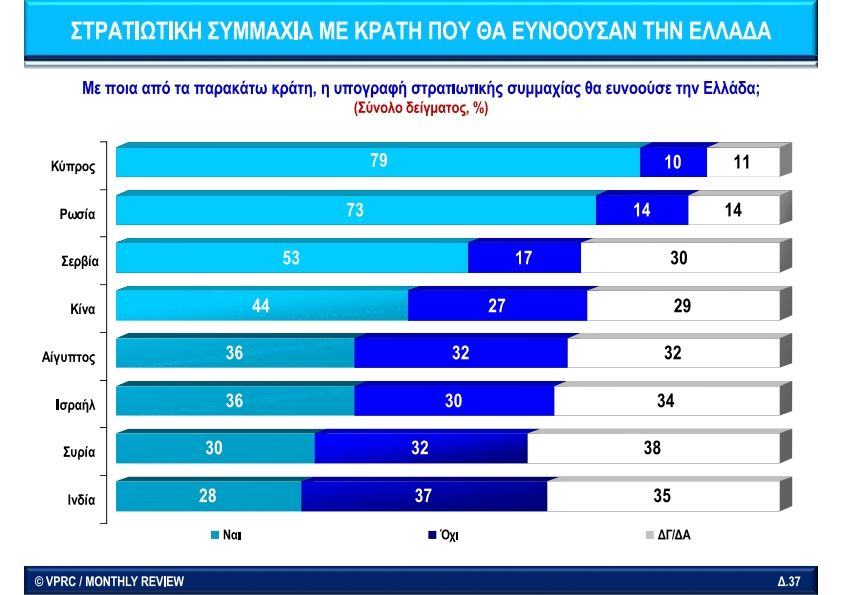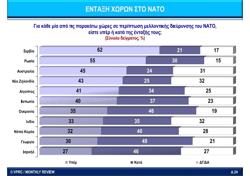 Αν δεν ήταν η πραγματική χρησιμότητα του ΝΑΤΟ κατά την περίοδο του Ψυχρού Πολέμου, η αξία συμμετοχής της Ελλάδας στο ΝΑΤΟ θα αξιολογούνταν θεαματικά χαμηλότερη, ενώ οι στρατιωτικοί υποστήριζαν θερμά την είσοδο της Σερβίας (62%) και της Ρωσίας (55%) ως μέλη του ΝΑΤΟ ή σε κάποια κοινή συμμαχία, προφανώς για να εξισορροπηθεί η επιθετικότητα της Τουρκίας, αλλά κυρίως η εκμετάλλευση της Ελλάδας από τις ΗΠΑ. Μόνο 35% υποστήριζαν την είσοδο της Ουκρανίας (46% ήταν αντίθετοι) και 30% της Γεωργίας (49% ήταν αντίθετοι). Σχετικά με στρατιωτικές συμμαχίες που θα ευνοούσαν την Ελλάδα, οι Έλληνες στρατιωτικοί έβλεπαν από το 2009 ακόμη, ότι οι πρώτοι σύμμαχοι θα έπρεπε να ήταν η Κύπρος με 79%, Ρωσία με 73%, Σερβία 53% και Κίνα με 44%.