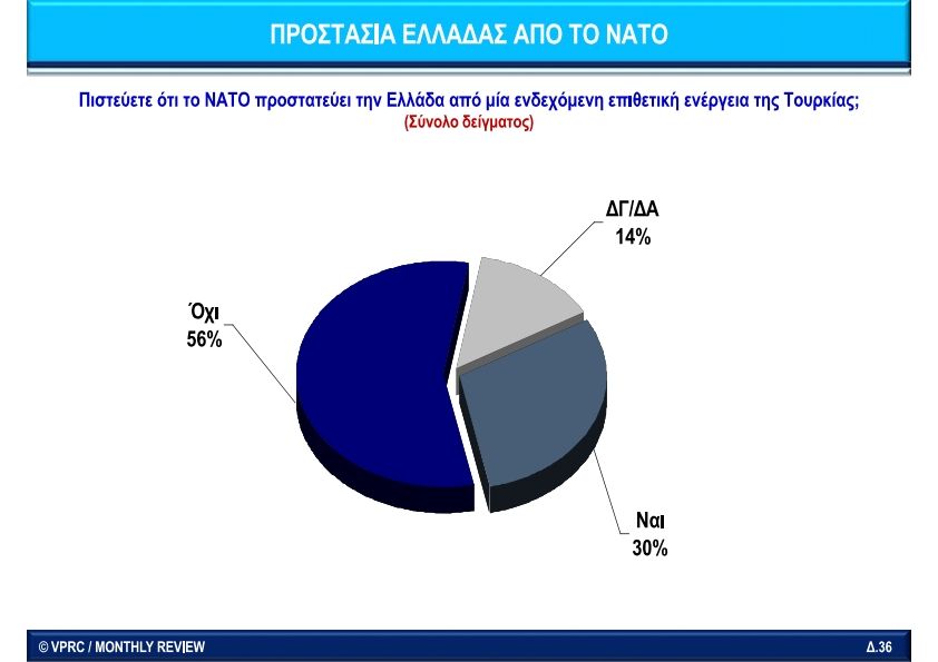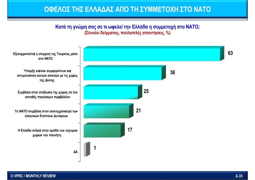 Σχετικά με την χρησιμότητα του ΝΑΤΟ η πρώτη απάντηση με 46% ήταν ότι το ΝΑΤΟ συμβάλλει στην πρωτοκαθεδρία της Δύσης σε παγκόσμια κλίμακα. Δηλαδή καμία σχέση με την αποστολή μίας Συμμαχίας να προστατεύει τα μέλη της. Είναι ξεκάθαρα επεκτατική προβολή ισχύος για κυριαρχία και όχι άμυνα. Μάλιστα στη ερώτηση αν το ΝΑΤΟ θα προστατεύσει την Ελλάδα από επίθεση της Τουρκίας το 56% απάντησε όχι και μόνο το 30% απάντησε ότι πίστευε το ΝΑΤΟ θα μας προστατεύσει. Τότε τί είδους «Συμμαχία» είναι, συμμαχία ποιών και κατά ποιών;