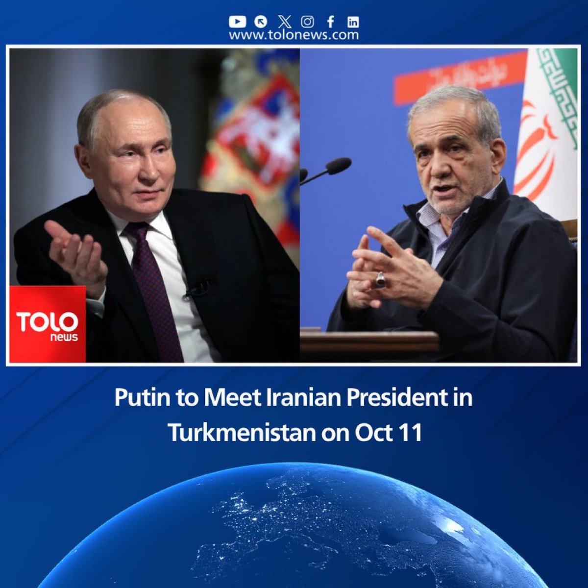 Σύμφωνα με πληροφορίες των ρωσικών ΜΜΕ ο Ρώσος πρόεδρος Βλαντίμιρ Πούτιν θα έχει συνάντηση με τον Ιρανό ομόλογό του Μασούντ Πεζεσκιάν στο Τουρκμενιστάν στις 11 Οκτωβρίου.