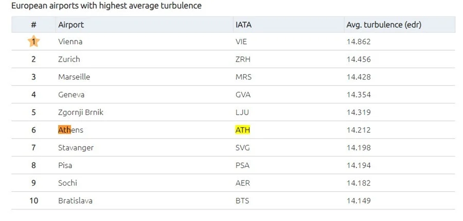 Συγκεκριμένα το αεροδρόμιο Ελευθέριος Βενιζέλος στην Αττική, βρίσκεται στην έκτη θέση της σχετικής λίστας των ευρωπαϊκών αεροδρομίων με μέσο όρο 14.212 αναταράξεις στην κλίμακα «Ρυθμού Διάχυσης Στροβιλισμού».