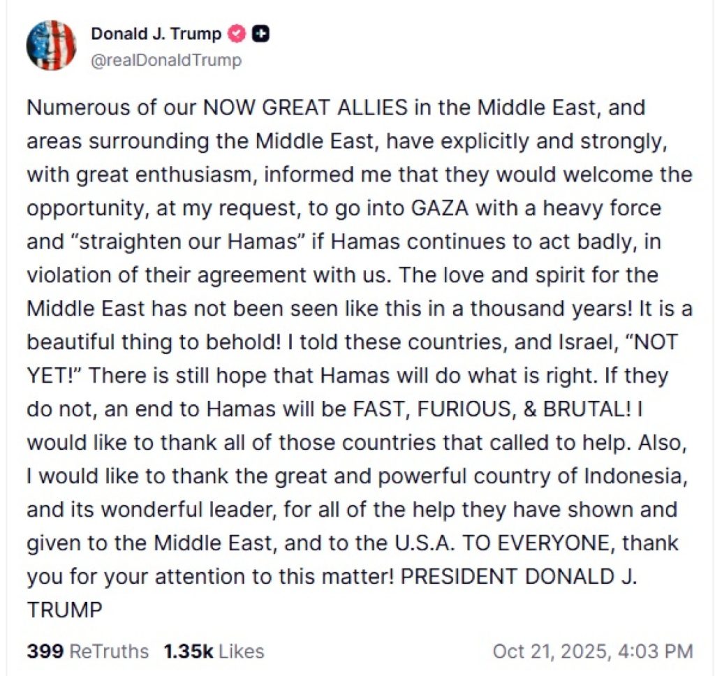 Με ανάρτησή του στην πλατφόρμα του Truth Social, ο πρόεδρος των ΗΠΑ, Ντόναλντ Τραμπ εξήγησε τι περιμένει τη Χαμάς, εάν τυχόν η παλαιστινιακή οργάνωση παραβιάσει τη συμφωνία με το Ισραήλ, τονίζοντας πως το τέλος της θα είναι σφοδρό και ανελέητο.